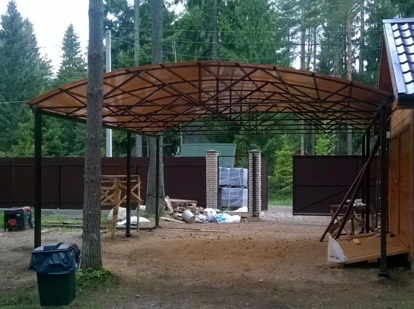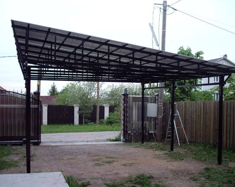 Обычно примыкают к дому под углом в 30-35о и защищают веранды, террасы или крыльцо от солнечных лучей и осадков.